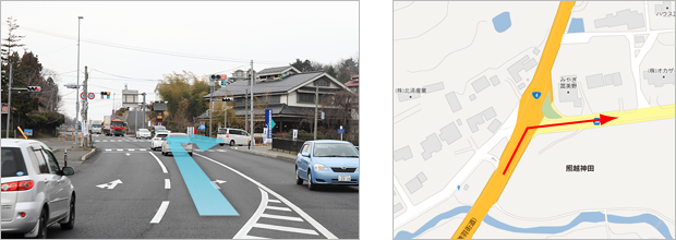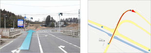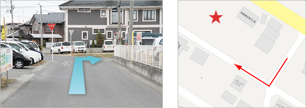 1.東北自動車道築館IC出口を「盛岡 築館」方面へ 2.ひとつめの信号を県道36号へ右折 3.道なりに進み直進して「みやぎ県北道路」に合流 4.終点のT字路を国道398号へ 5.道なりに進みNTT東日本ビルを過ぎた次の信号、「中華料理天華」前を右折 6.エネオススタンドと東北三菱の間の路地を左折 7.ひとつめの十字路を右折