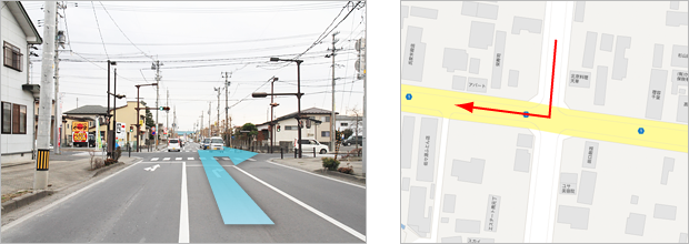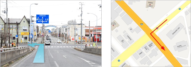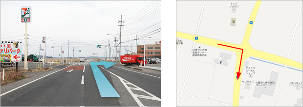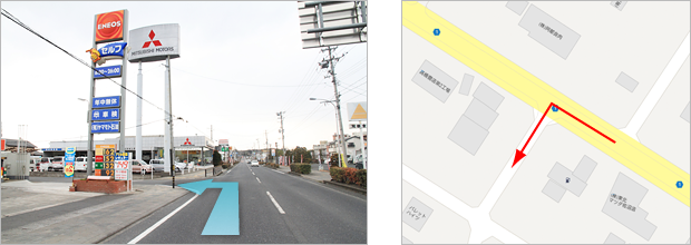 1.東北自動車道築館IC出口を「若柳花泉」方面に右折 2.セブンイレブン前の交差点を右折 3.七十七銀行前を県道185号方向に右折 4.氏家医院前を国道398号方面に左折 5.道なりに進みNTT東日本ビルを過ぎた次の信号、「中華料理天華」前を右折 6.エネオススタンドと東北三菱の間の路地を左折 7.ひとつめの十字路を右折
